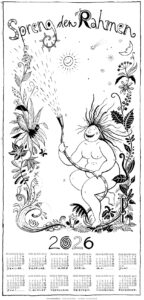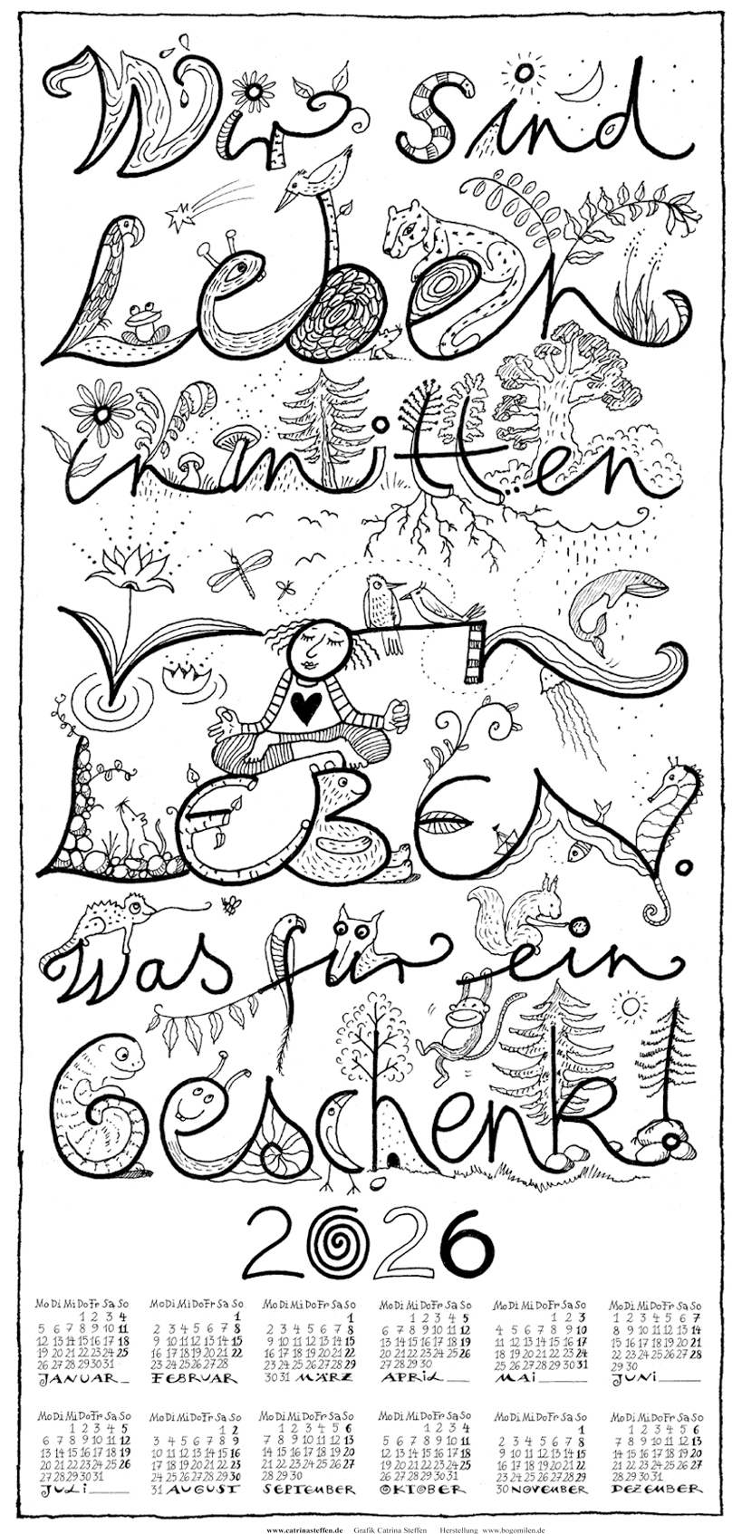 die neuen Jahreskalender 2026 sind da und freuen sich auf eure Bestellungen. Wie immer, sind sie auf schönen Karton gedruckt und von mir mit Silber, Gold und Bronze von Hand coloriert und signiert. Sie erinnern dich daran, das Leben mit Humor, Zuversicht und einem liebevollen Blick zu betrachten, auch und gerade in herausfordernden Zeiten.